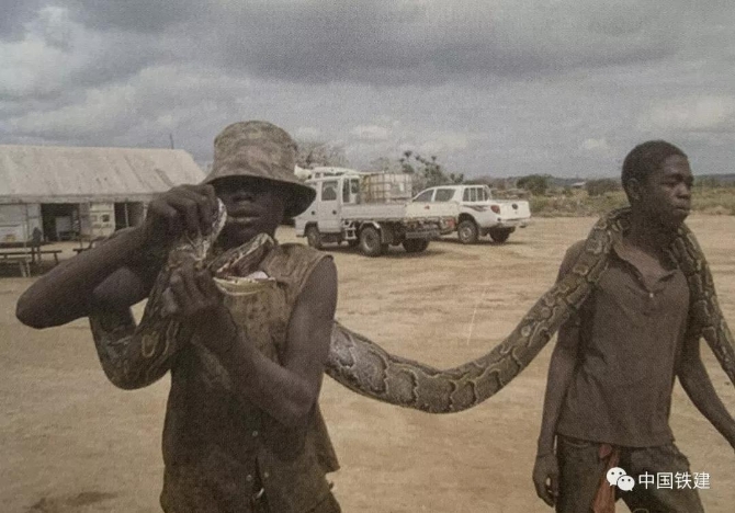 自幼培養(yǎng)的野外生存技能是本地員工與中方員工的最大區(qū)別,圖為兩名員工展示在工作中捕獲的蟒蛇