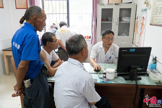 北團(tuán)村社區(qū)醫(yī)院的醫(yī)務(wù)室里柏志華正在為村民看病。 中國(guó)網(wǎng) 楊佳 攝影