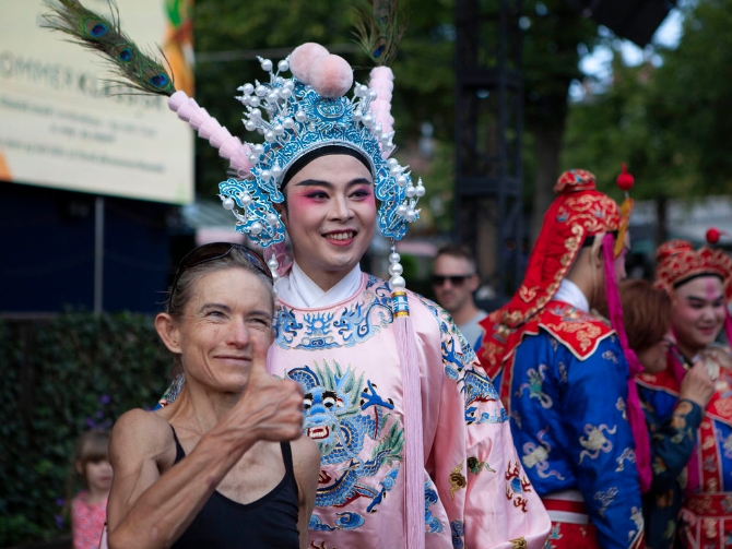 8月3日,在丹麥首都哥本哈根,觀眾和中國福建省實驗閩劇團的演員合影。新華社 記者林晶/攝