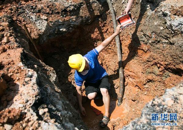 8月1日上午,在長沙市柏家河路,長沙水業(yè)集團(tuán)供水公司城南分公司搶修中心管網(wǎng)維修人員韓彪對(duì)檢測出的暗漏安裝管道堵漏器。近日,長沙連續(xù)高溫天氣,導(dǎo)致城市用水量大增,為保障群眾生活用水和城市消防用水等需求,長沙供水人夜以繼日堅(jiān)守崗位,做好供水保障工作。新華社發(fā)(陳思汗/攝)