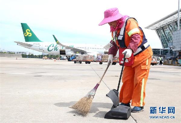 7月31日,機(jī)場保潔員秦彩芳在上海浦東國際機(jī)場停機(jī)坪進(jìn)行保潔作業(yè)。 連日來,上海天氣炎熱。面對(duì)持續(xù)高溫,上海機(jī)場一線員工堅(jiān)守在崗位上,一絲不茍為機(jī)場安全運(yùn)行保駕護(hù)航。 新華社記者 陳飛/攝