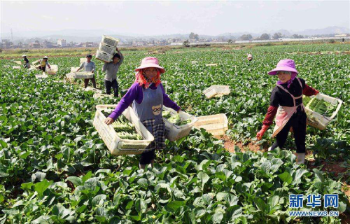 硯山縣稼依鎮(zhèn)小稼依村的農婦在蔬菜種植基地收菜