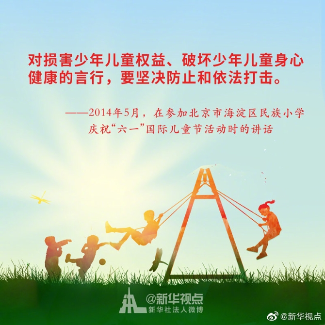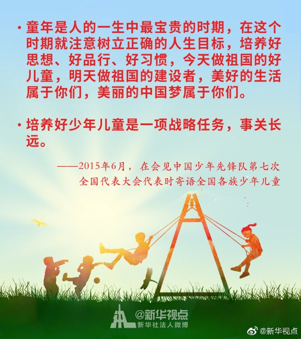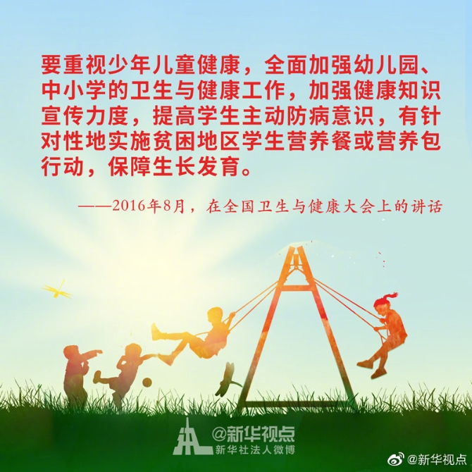 少年兒童是祖國的花朵,民族的希望。幼有所育,讓每一名少年兒童都能伴隨著時代的腳步茁壯成長,是全社會共同的心愿。習近平總書記始終關心少年兒童的身體健康和成長成才。黨的十八大以來,習近平總書記這樣說?
