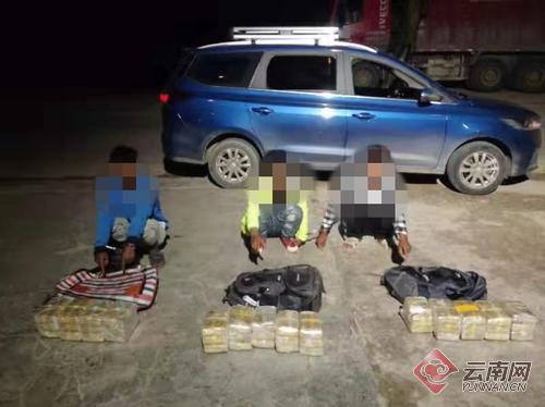 7月29日,河底崗邊境檢查站根據(jù)線索,及時出動警力前往核查封控,在轄區(qū)成功抓獲一個販毒團(tuán)伙,從3名男子攜帶的雙肩背包內(nèi)查獲外用黃色膠帶包裹的毒品冰毒23.26公斤。