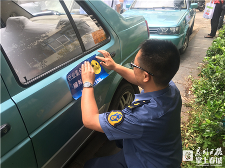 下午14時,記者在市出租汽車管理局樓下看到工作人員正在對列為重點監(jiān)管的車輛兩側(cè)粘貼印有“行業(yè)重點監(jiān)管”的標(biāo)識?!氨敬握迟N標(biāo)識的車輛是去年下半年和今年上半年年統(tǒng)計出來的第一批重點監(jiān)管車輛,是行業(yè)內(nèi)服務(wù)質(zhì)量差、投訴較多的車輛和人員?!笔谐鲎馄嚬芾砭窒嚓P(guān)負(fù)責(zé)人介紹,粘貼之后,駕駛員不得私拆監(jiān)管標(biāo)識,對私自拆除“行業(yè)重點監(jiān)管”標(biāo)識的,市出管局將嚴(yán)格按《昆明市客運出租汽車管理條例》予以處罰,歡迎廣大市民共同監(jiān)督。