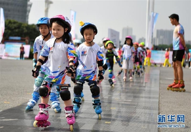 8月8日,小朋友們在河南省分會場練習(xí)輪滑。當(dāng)日,2019年全國“全民健身日”活動河南省分會場暨鄭州市全民健身日群體展演活動在河南省鄭州市鄭東新區(qū)如意湖廣場舉行。本次活動以“健康中國·你我同行”為主題,展示了廣播體操、健身秧歌、瑜伽等全民健身項目。 新華記者李嘉南/攝