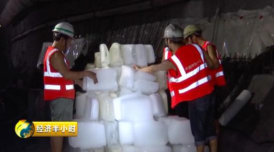 而在新華隧道出口的另一段,工人們則是每天在30多度的高溫下施工。由于隧道開挖長(zhǎng)度大,最大埋深1000多米,現(xiàn)在屬于爬坡階段,在穿越埋深較大的區(qū)域時(shí),隧道內(nèi)溫度逐漸升高,工人們只能靠從外面運(yùn)進(jìn)來的冰塊解暑,而冰塊不到6、7個(gè)小時(shí)就會(huì)化掉。