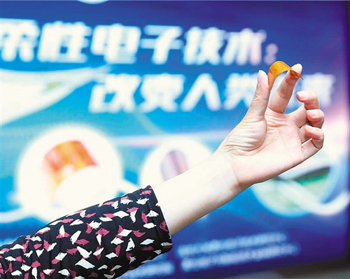 在第二屆柔性電子國際學(xué)術(shù)大會上,研發(fā)人員現(xiàn)場展示可任意卷曲彎折的超薄柔性芯片。周燁攝