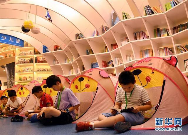 參加青島棧橋書店夜宿活動(dòng)的小讀者在睡前讀書會(huì)上閱讀(7月24日攝)。新華社記者 李紫恒 攝