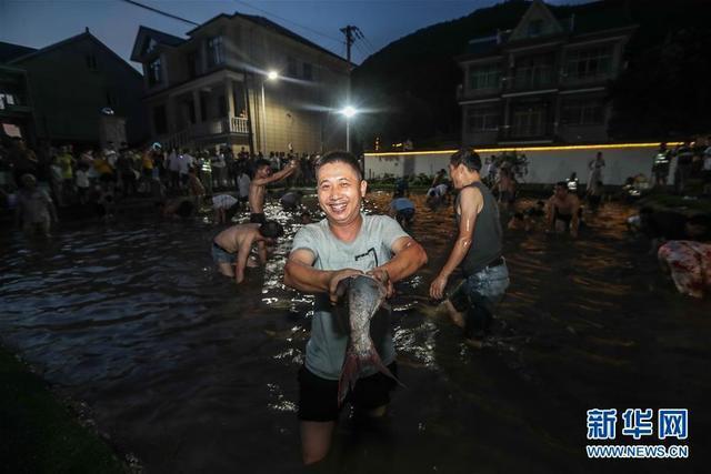 游客在杭州市富陽區(qū)胥口鎮(zhèn)上練村參加趣味摸魚活動(dòng)(7月26日攝)。新華社記者徐昱攝