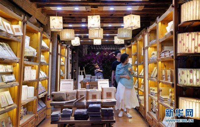 游客在云南麗江古城挑選東巴紙文創(chuàng)產(chǎn)品(6月6日攝)。新華社記者秦晴攝