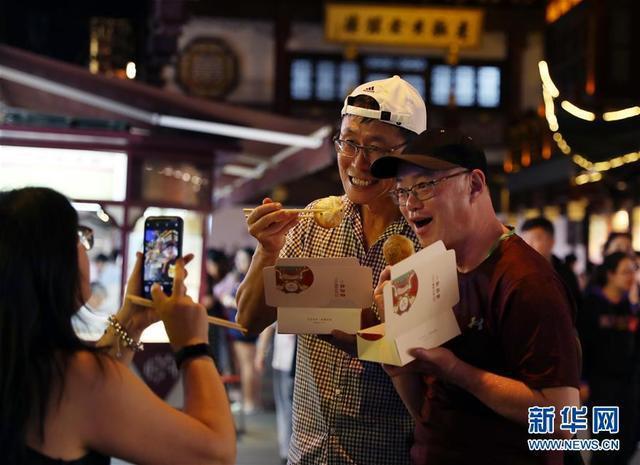 游客在上海豫園夜市拍照留念(6月4日攝)。新華社記者劉穎攝