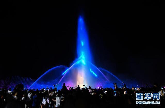 人們在吉林長春凈月潭國家森林公園內(nèi)欣賞音樂噴泉水景燈光秀(8月4日攝)。新華社記者張楠攝