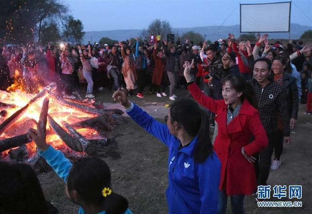 游客和當(dāng)?shù)厝罕娫诟拭C省臨洮縣馬家窯村圍著篝火跳舞(5月15日攝)。新華社記者馬寧攝