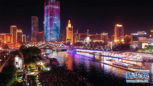 天津解放橋在夜色中開啟橋面,周邊燈火璀璨引萬人圍觀(7月1日攝)。新華社記者李然攝