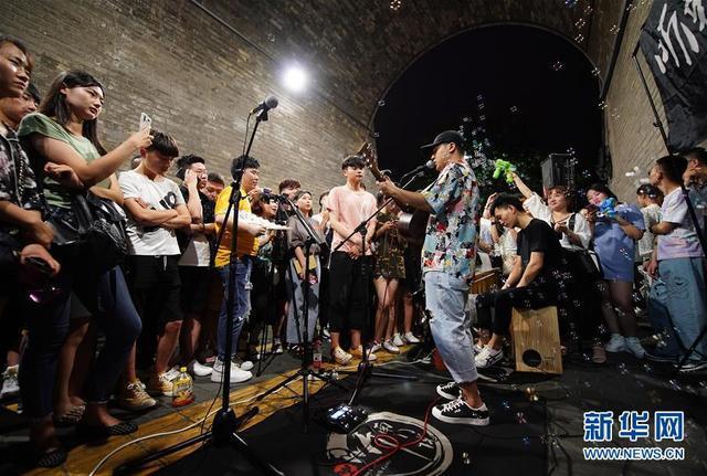 人們在西安城墻南門下觀看樂隊(duì)表演(7月4日攝)。 新華社記者邵瑞攝