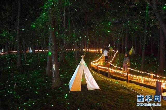 游客在河北省沙河市紅石溝現(xiàn)代農(nóng)業(yè)園區(qū)夜間舉辦的“夢幻燈光節(jié)”上游玩(6月28日攝)。新華社記者牟宇攝