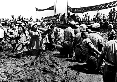1952年,廣大軍民奮戰(zhàn)在荊江分洪水利工程上。(資料圖片)