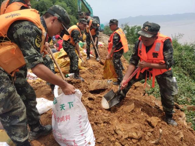 7月10日,衡陽支隊官兵正在組織裝填沙袋。