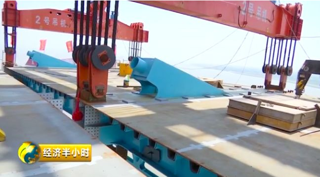 在江蘇如皋的一個造船廠中,《經(jīng)濟半小時》記者看到一個長28米、寬35米、高16米的大橋整段鋼梁,放在兩臺分別承重1000噸的28軸模板車上,準備運往大橋起吊現(xiàn)場。