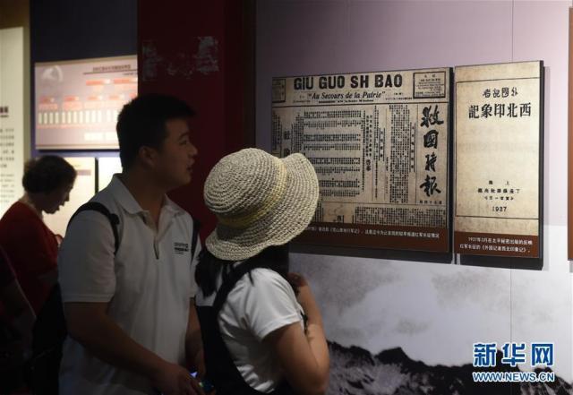 8月16日,在紅軍長征哈達(dá)鋪紀(jì)念館展廳內(nèi),觀眾參觀展出的較早報道紅軍長征情況的報紙《救國時報》。新華社記者 羅曉光 攝