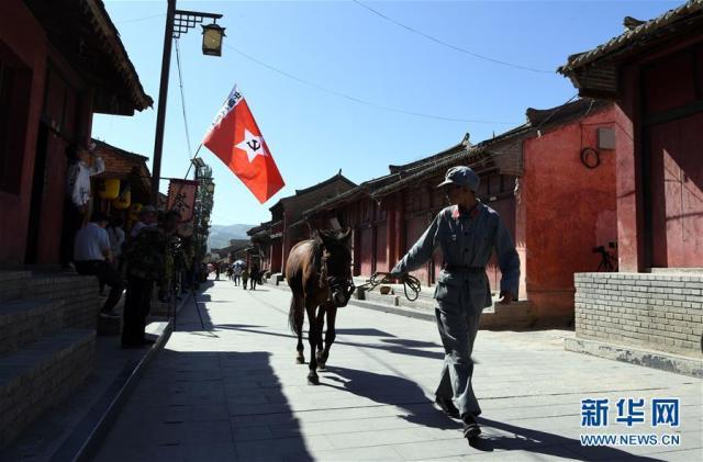 8月16日,一名身穿紅軍服的少年?duì)狂R走在哈達(dá)鋪鎮(zhèn)紅軍街上。當(dāng)?shù)厝罕娊?jīng)常為游客表演再現(xiàn)紅軍經(jīng)過哈達(dá)鋪場景的節(jié)目。新華社記者 馬寧 攝