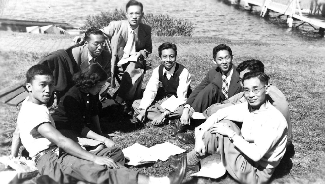 1949年,梁思禮(左一)與留美學(xué)生參加CSCA小組會
