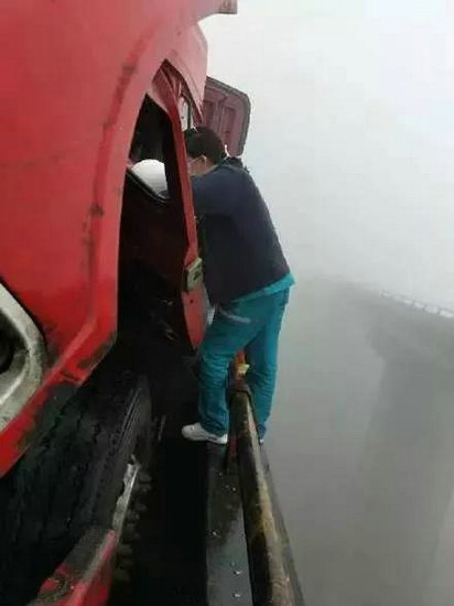 她身著救援服,腳踩橋欄桿