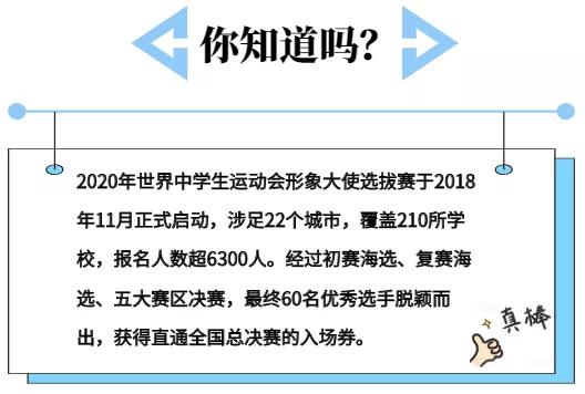 ?據(jù)了解,2020年世界中學生運動會開幕式倒計時一周年活動,組委會將正式授予獲獎選手形象大使、風尚大使、文化推廣大使、青春大使、體育推廣大使以及網(wǎng)絡推廣大使榮譽稱號。