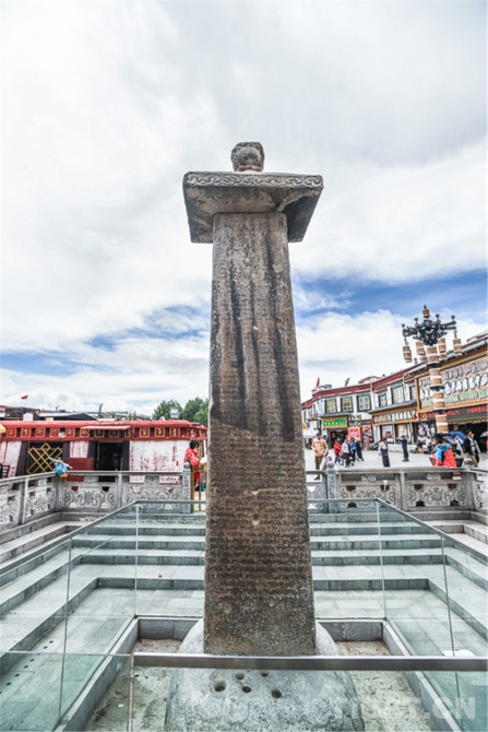 這塊立于公元823年的石碑,是歷史上有名的“甥舅和盟碑”。碑陽及兩側(cè)以漢藏兩種文字刻載著盟誓全文,碑陰以藏文刻載著唐蕃友好關(guān)系史及長慶元年在長安、二年在邏些(拉薩)兩地盟誓的意義。歷史記載,此碑立后,唐蕃之間的紛爭從此宣告結(jié)束。此碑也成為了民族團結(jié)、友好的歷史見證。