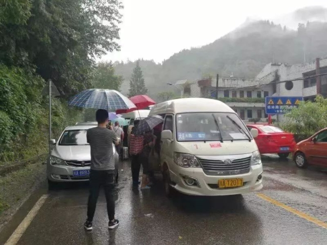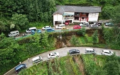 從20日中午開始,一些有車的游客,在引導(dǎo)下經(jīng)鷂子山村道撤離;大量沒有車的游客排成長隊,在當?shù)卣囊龑?dǎo)下,坐上村民的私家車出山。