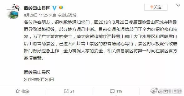 20日,西嶺雪山景區(qū)突降暴雨,導(dǎo)致道路損毀、部分地方通訊中斷,景區(qū)內(nèi)外都有游客滯留。