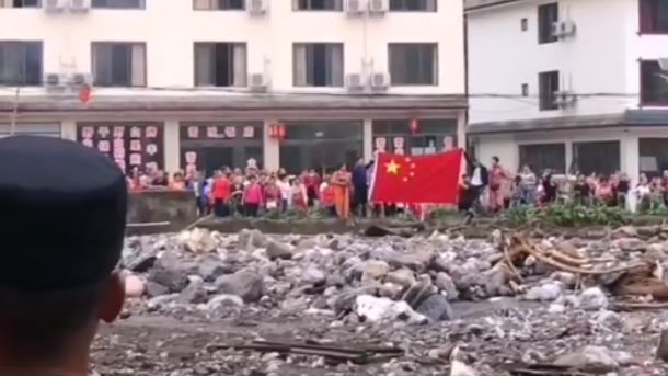 大家自發(fā)拿著國旗在河對岸等待救援。