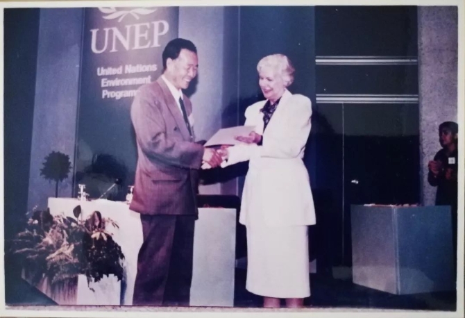 1994年6月蘭州局集團(tuán)公司中衛(wèi)工務(wù)段張克智代表中衛(wèi)固沙林場從時(shí)任聯(lián)合國副秘書長伊麗莎白手中接過聯(lián)合國環(huán)境規(guī)劃署頒發(fā)的“全球環(huán)境保護(hù)500佳先進(jìn)單位”證書