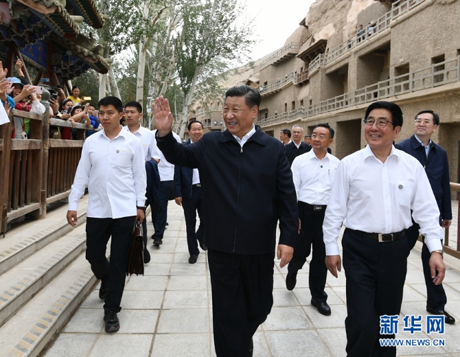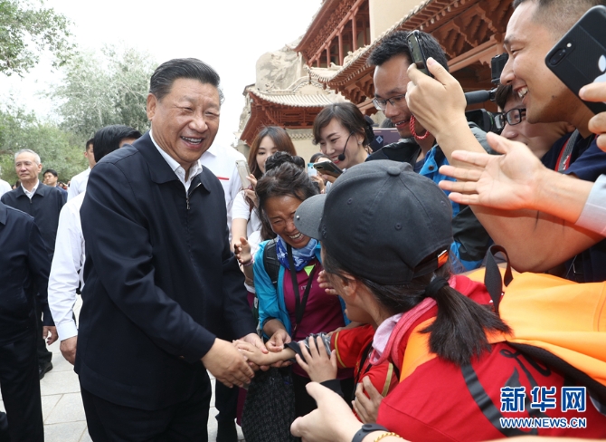 習(xí)近平在敦煌莫高窟考察調(diào)研時,向正在參觀的游客親切招手致意。