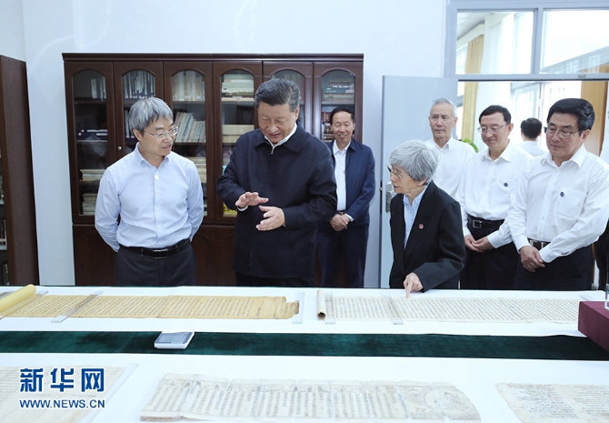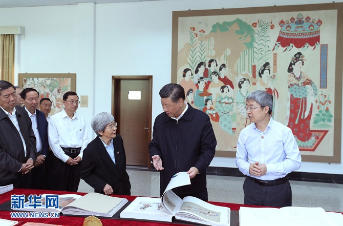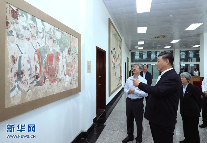 習(xí)近平在敦煌研究院察看珍藏文物和學(xué)術(shù)成果展示,了解文物保護(hù)和研究、弘揚(yáng)優(yōu)秀歷史文化情況。