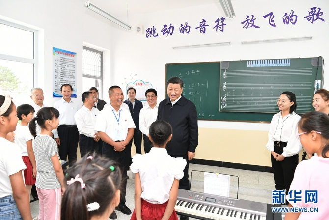 習(xí)近平在武威市古浪縣黃花灘生態(tài)移民區(qū)富民新村富民小學(xué)的音樂教室,認(rèn)真觀看正在進(jìn)行的音樂課教學(xué)。