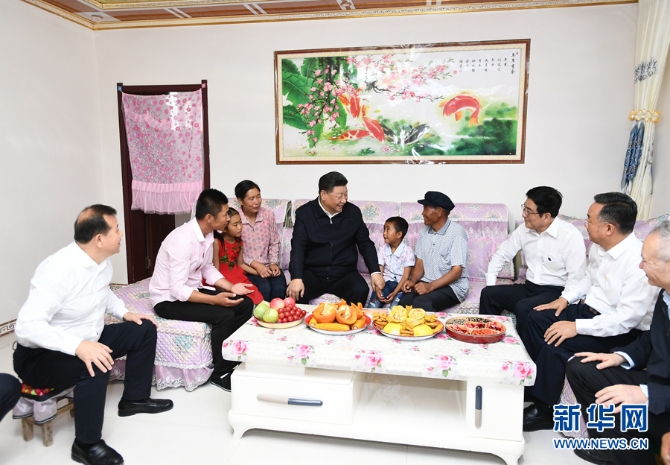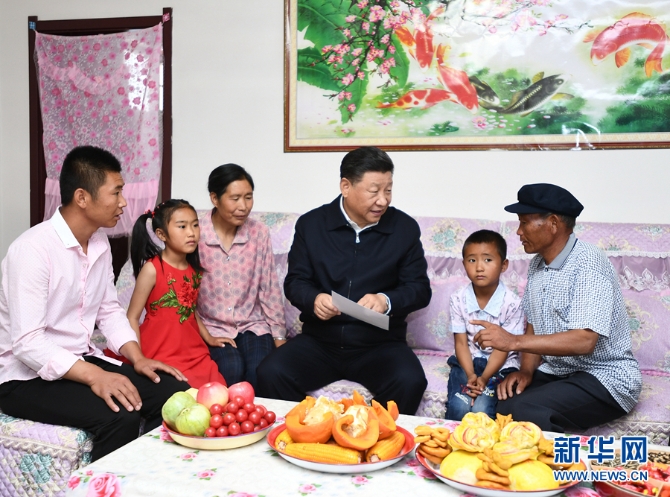 習(xí)近平在武威市古浪縣黃花灘生態(tài)移民區(qū)富民新村村民李應(yīng)川家,同李應(yīng)川一家拉家常。