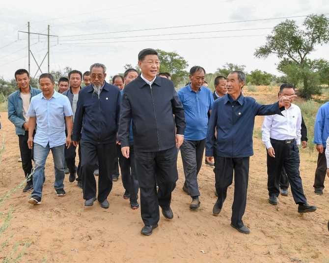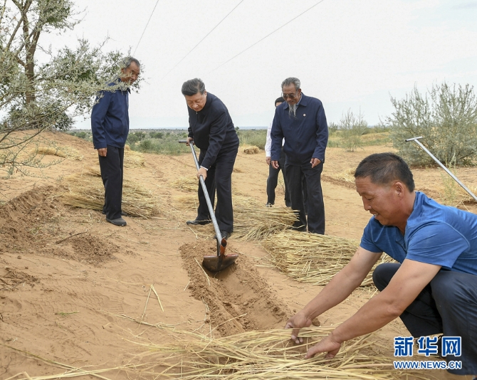 習(xí)近平在武威市古浪縣八步沙林場實地了解“草方格壓沙”作業(yè)。