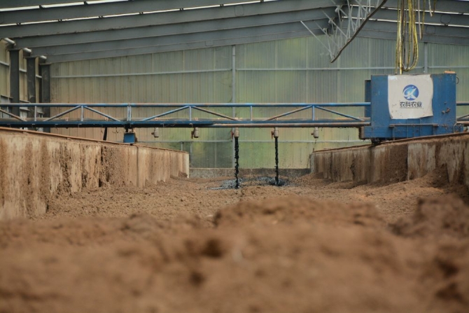 永誠(chéng)公司用的是福建省首創(chuàng)的“異位發(fā)酵床”技術(shù),糞污通過預(yù)埋的管道,輸送到另一個(gè)廠房的儲(chǔ)液池內(nèi)。只要輕輕按下按鈕,一臺(tái)半自動(dòng)化機(jī)械就能將收集好的糞污撒到木屑、谷殼等墊料上,發(fā)酵后既是上好的有機(jī)肥原料,也是培養(yǎng)菌菇的優(yōu)質(zhì)基質(zhì)。