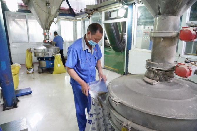 福建明圣生物制品有限公司工人在生產(chǎn)車間包裝利用雞血制成的蛋白飼料。新華社記者 林善傳/攝