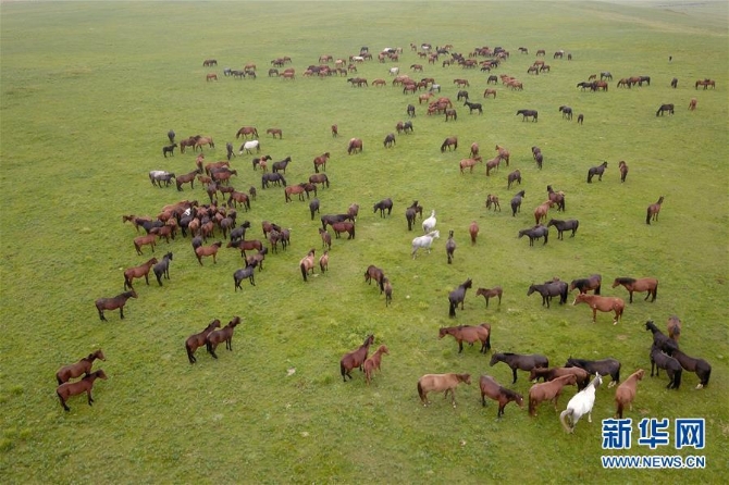 這是在中農(nóng)發(fā)山丹馬場有限責(zé)任公司一場拍攝的馬群(8月21日無人機(jī)拍攝)。新華社記者 范培珅 攝
