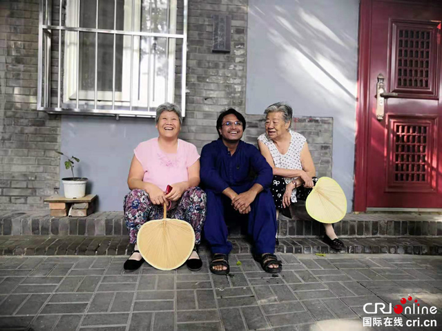 亞希爾(中)在胡同里與乘涼的居民合影 李勝蘭/攝