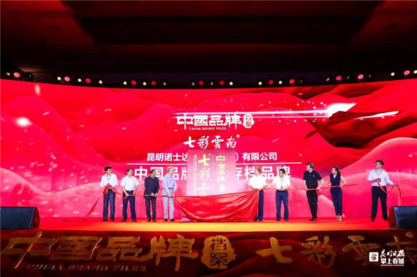 首映式現(xiàn)場(chǎng),伴隨著屏幕內(nèi)緩緩打開的卷軸,中國(guó)品牌成長(zhǎng)的一幕幕再次呈現(xiàn)。出席首映禮的領(lǐng)導(dǎo)和嘉賓一起上臺(tái),共同揭下紅綢,“七彩云南”品牌正式成為中國(guó)品牌檔案首批存檔品牌。