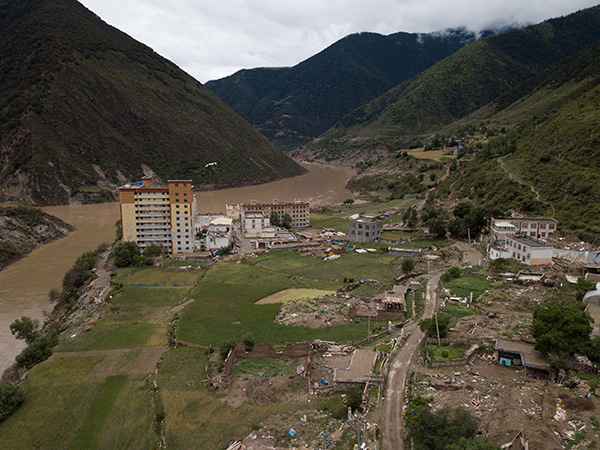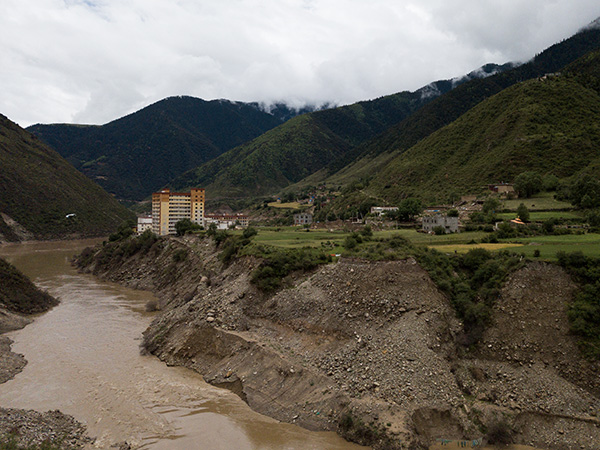 藏曲河與金沙江交匯處還可看到被沖毀的村莊。遠(yuǎn)處是金沙江,塌方位置大概在金沙江下游方向6公里處。