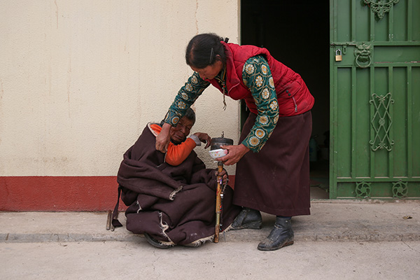 扎拉今年60歲,和83歲的老母親相依為命。一家的生計(jì)全靠扎拉種地、在山里采一些松茸和蟲草拿去賣。村里風(fēng)景秀美,但出行十分不便。當(dāng)?shù)卮迕窈芫貌湃タh城趕一次集。