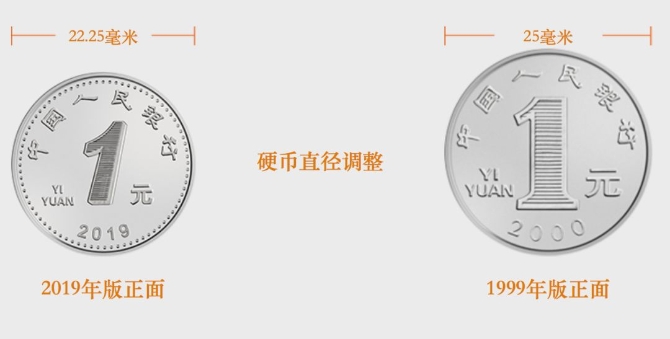 直徑由25毫米調(diào)整為22.25毫米。正面面額數(shù)字“1”輪廓線內(nèi)增加隱形圖文“?”和“1”,邊部增加圓點(diǎn)。材質(zhì)保持不變。