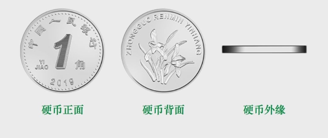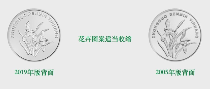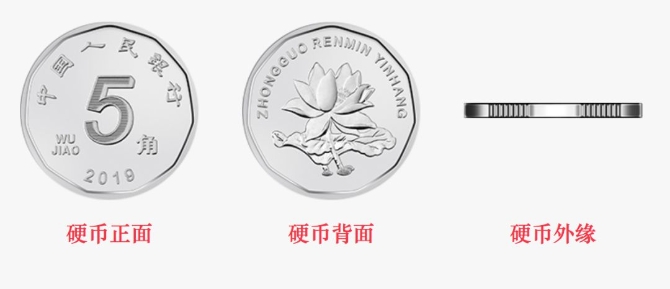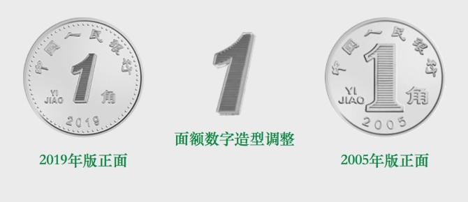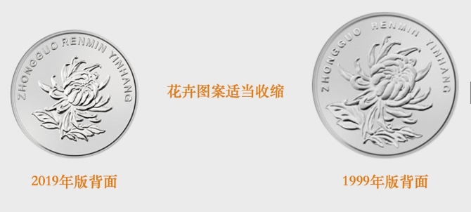 2019年版第五套人民幣1元、5角、1角硬幣分別保持1999年版第五套人民幣1元、5角硬幣和2005年版第五套人民幣1角硬幣外形、外緣特征、“中國(guó)人民銀行”行名、漢語拼音面額、人民幣單位、花卉圖案、漢語拼音行名等要素不變,調(diào)整了正面面額數(shù)字的造型,背面花卉圖案適當(dāng)收縮。