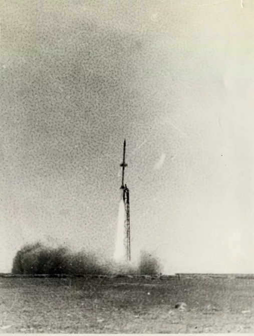 1958年9月8日,由北京工業(yè)學院(現(xiàn)北京理工大學)研制發(fā)射的二級固體探空火箭“東方-1號”發(fā)射。圖片來源:北京理工大學新聞網(wǎng)
