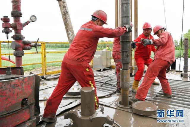 大慶油田1205鉆井隊的第21任隊長張晶(右二)與工人們在進行作業(yè)(6月27日攝)。新華社記者 王建威 攝